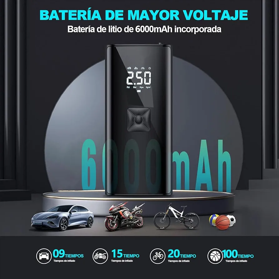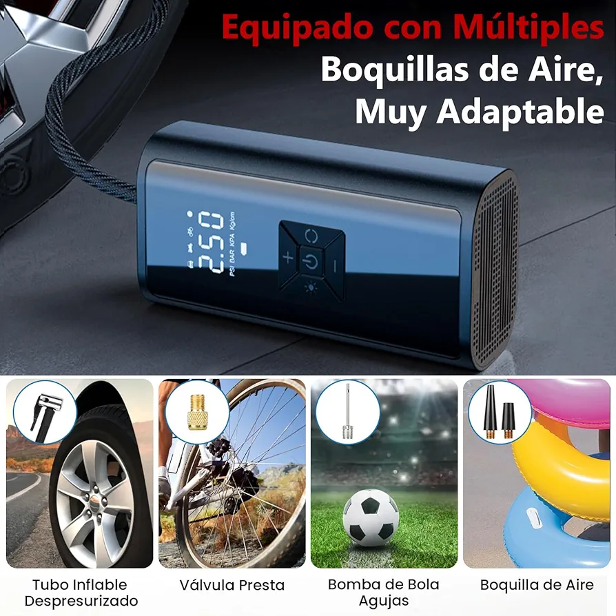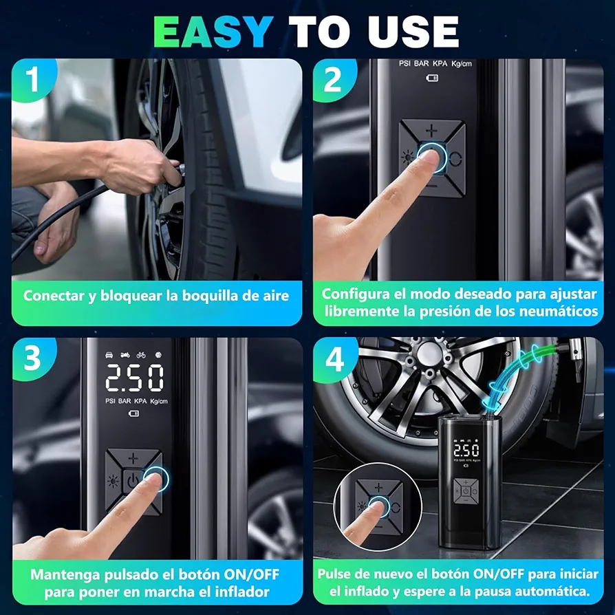 Olvídate del estrés de buscar una gasolinera o sudar con bombas manuales. Te presentamos al Salva-Vidas 4 en 1: El Inflador Turbocargado Inalámbrico que todo conductor inteligente debe tener en su guantera.