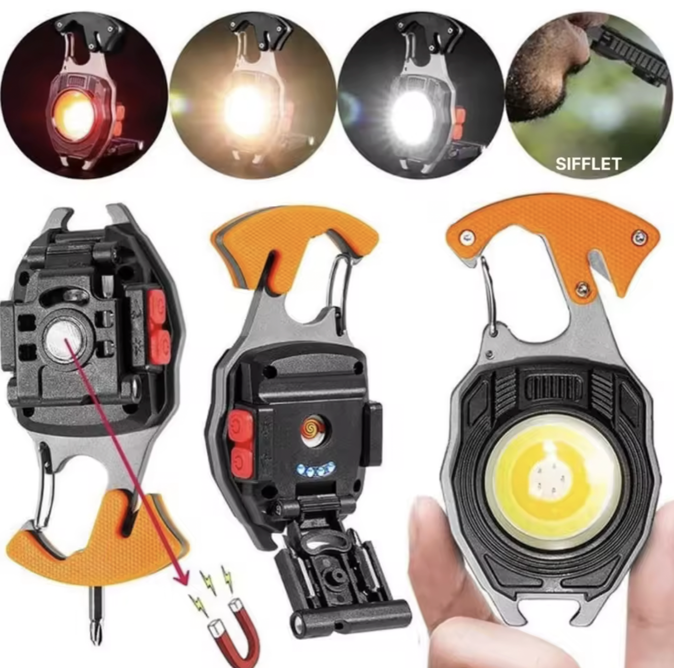 Llavero multifuncional ideal para uso diario. Incluye linterna LED brillante y encendedor práctico, compacto y resistente. Perfecto para emergencias, camping o llevar siempre a mano contigo seguro.
